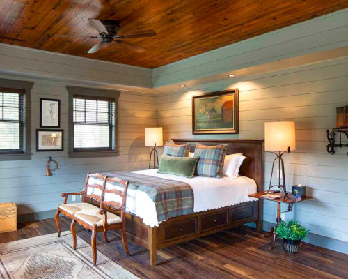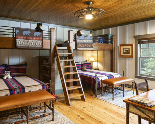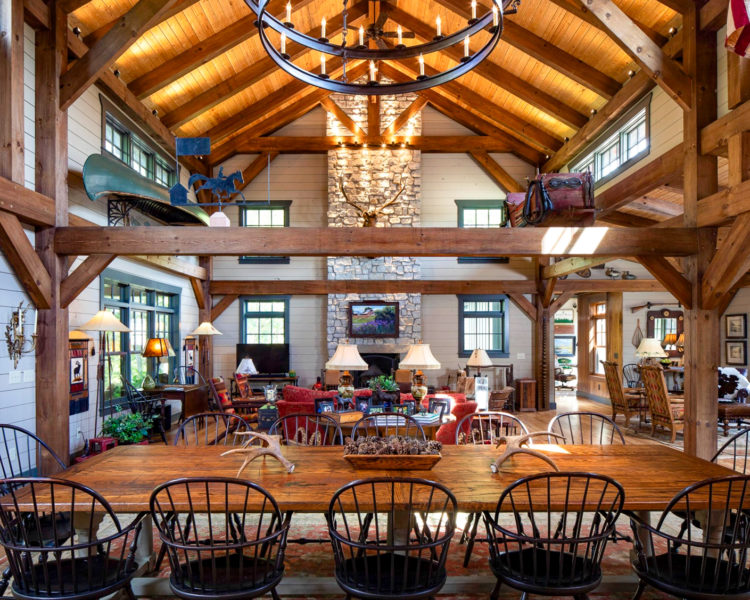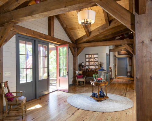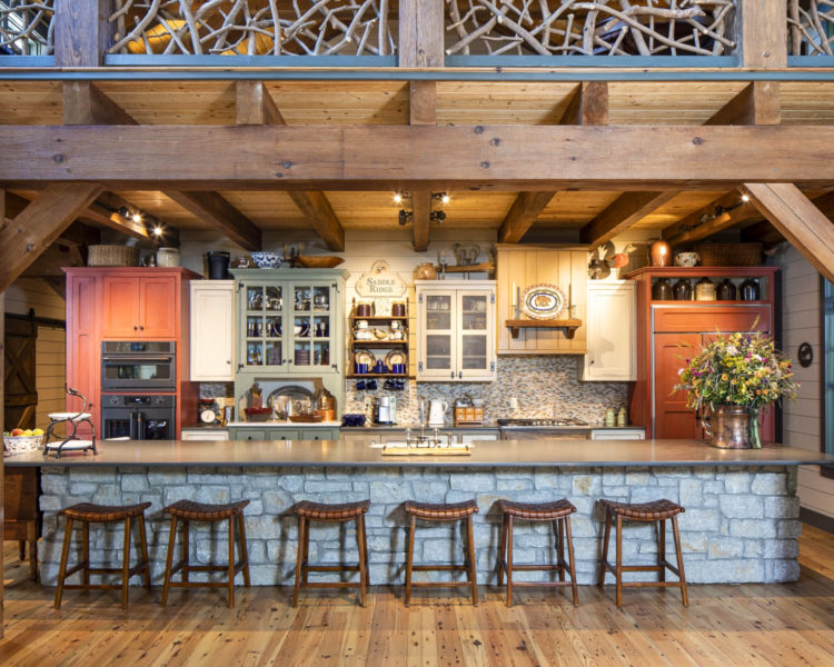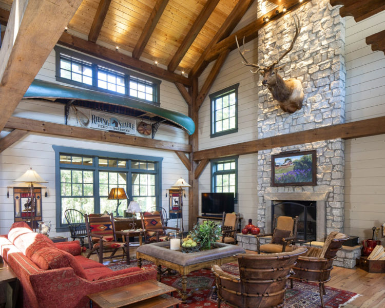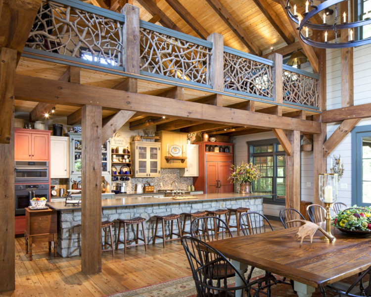 枝の手すりがワンポイントに。2階の床は根太とフローリングをそのまま見せたワイルドな納まり。