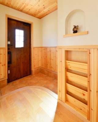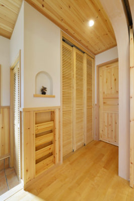 柔らかな曲線美: 玄関の框(かまち)や開口部には、優しい「R(曲線)」を採用。